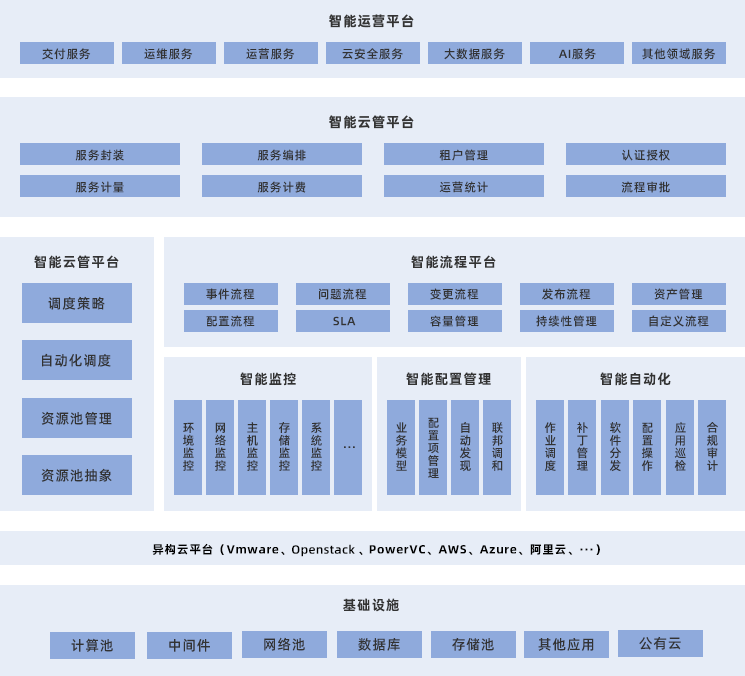 智能云管理具備承上啟下的作用,是基于云的全生命周期一體化管理解決方案。具有服務快速封裝及發布,異構資源池的管理及智能化調度,多租戶的管理,彈性伸縮,一體化運營的能力。