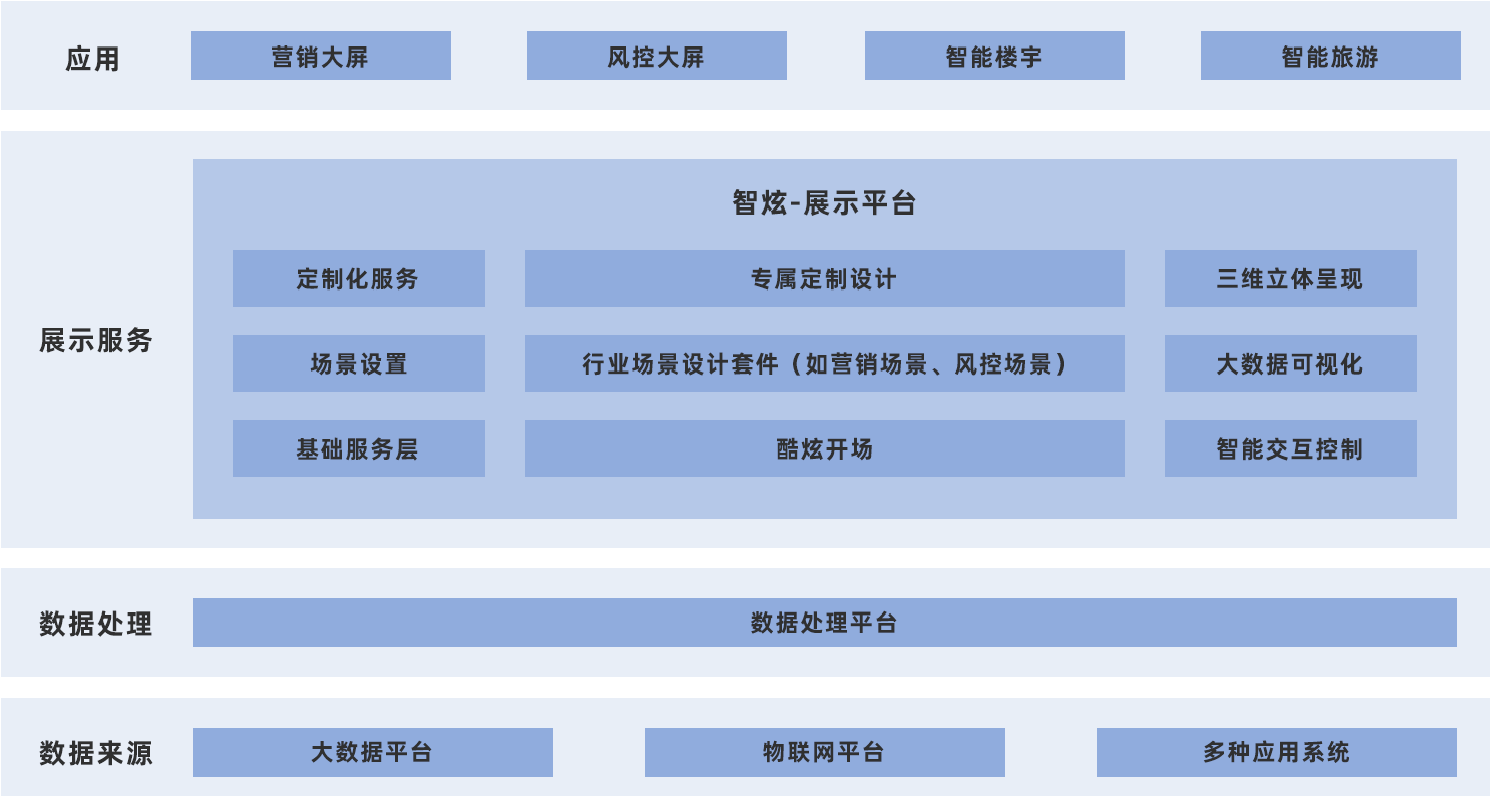 包括對外展示實(shí)力的智能營銷大屏、宣傳大屏,對內(nèi)管理的決策分析大屏、風(fēng)控大屏、智能旅游大屏、智能樓宇等。