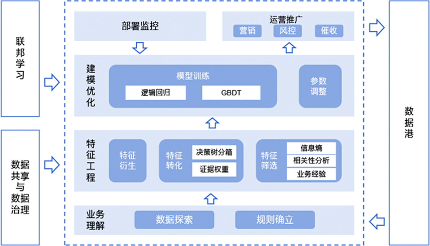 智鯤-陽光評分由光大科技和光大銀行聯(lián)合研發(fā),以光大集團豐富的客戶業(yè)務表現(xiàn)數(shù)據(jù)為基礎,以綜合履約能力、客戶活躍與生命周期管理、客戶綜合收益評估為主體,覆蓋多個場景和產(chǎn)品,用數(shù)據(jù)科學的手段量化客戶屬性的評分體系,旨在為客戶提供更加優(yōu)質(zhì)的產(chǎn)品與服務。隨著集團數(shù)據(jù)港的建設,特別是聯(lián)合學習平臺的搭建,評分方案和服務向集團成員輻射輸出。
