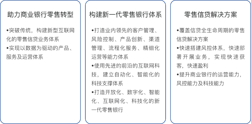 提供完整零售信貸全生命周期解決方案,助力商業(yè)銀行從無(wú)到有搭建或完善優(yōu)化零售信貸業(yè)務(wù)體系。